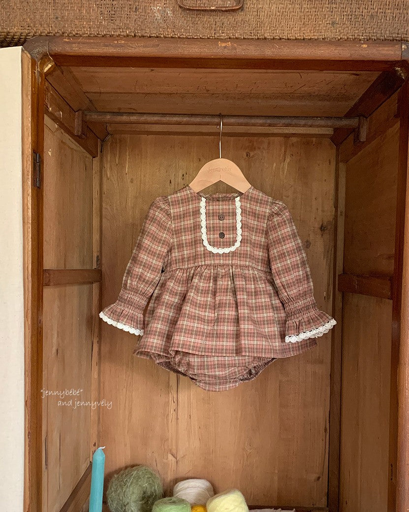ギャザースリーブチェックロンパース
